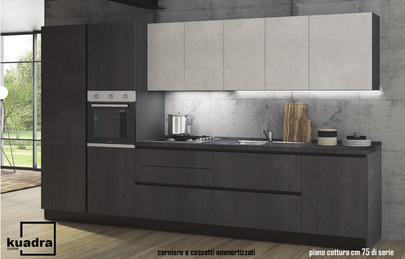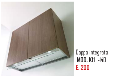 Elementi presenti nella composizione Colonna frigo combinata h.2.16, colonna forno h. 2.16, pensile cm 90 h72 con cappa integrata, pensile cm 60 h72, pensile colap. cm 90 h72, base con 2 cass+cest. slow mot. cm 90 con porta posate, anta lavast. da cm 60, base sottolavello 2 cestoni cm 90 . tops laminato spess.4 cm, zoccoli h12, e alzatina triangolare h3 cm.
